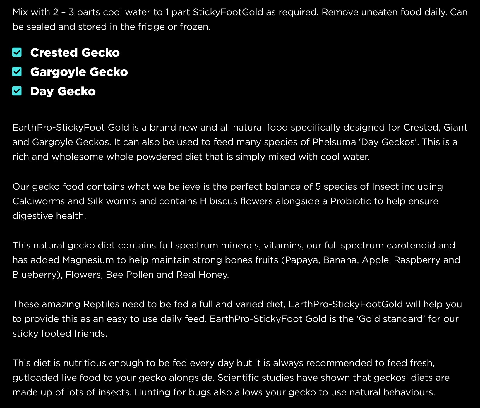A high insect, high fruit, all-natural, complete diet for Geckos, with bee pollen, vitamins, minerals and magnesium.